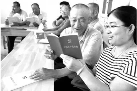 山东省惠民县在“两学一做”学习教育中,通过组织开展集中学习、专题研讨及“千名书记讲党课”等活动,引导党员强党性、提素质、树形象。图为该县皂户李镇康家堡村召开的党员会上,78岁的老党员康风泉(右二)正在与年轻党员交流学习党章心得。 刘新武摄