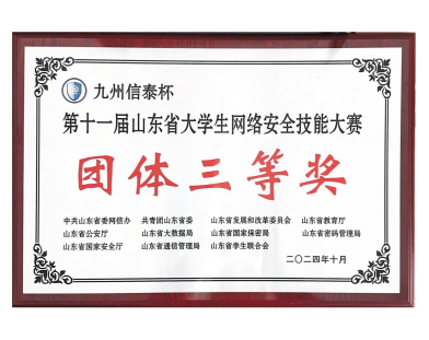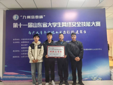 2024年10月28日,由中国信息安全测评中心作为指导单位,省委网信办、团省委、省发展改革委、省教育厅、省公安厅、省大数据局、省国家保密局、省密码管理局、省国家安全厅、省通信管理局、省学生联合会为主办单位,山东信息协会、济宁市委网信办、曲阜师范大学、国家互联网应急中心山东区、山东省社会信用中心为承办单位的“九州信泰杯”第十一届山东省大学生网络安全技能大赛”在曲阜师范大学隆重举行。经过激烈角逐,我校贾元帅老师指导的参赛团队荣获比赛三等奖。
