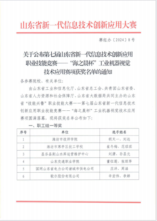 在第七届山东省新一代信息技术创新应用职业技能竞赛 ——“海之晨杯” 工业机器视觉技术应用赛项的舞台上,近日传来了振奋人心的消息。教师组和学生组选手们凭借卓越的技能和出色的发挥,双双荣获二等奖,展现了我省教育领域在工业机器视觉技术应用方向的强大实力。