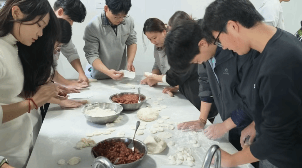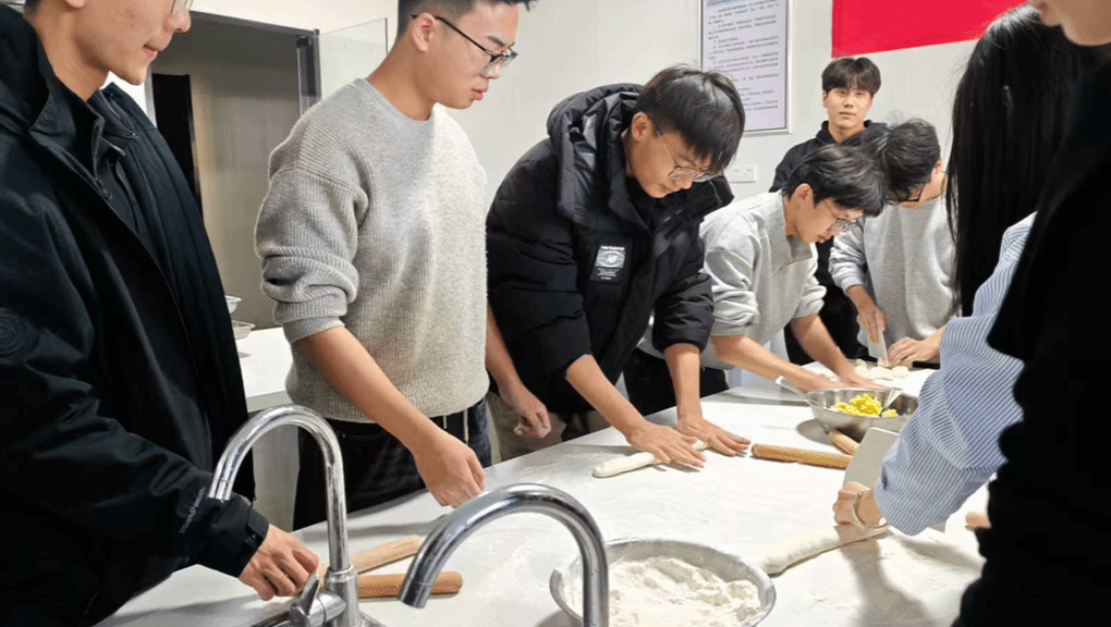 下午2时,活动在欢声笑语中拉开序幕。师生们分工协作,默契十足:部分同学早早在一楼布置好场地;三楼则化身为热闹的“饺子工坊”,大家围坐在一起,拌馅、擀皮、包捏,动作由生疏到熟练,形态各异的饺子很快摆满了托盘。现场还准备了饮料、瓜果等零食,更添节日氛围。