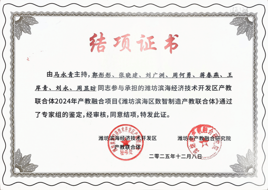 近日,由我校机电工程学院马永青院长主持,郭彤彤、张晓建、刘广洲、周何勇、蒋春燕、王岸青、刘永、周显肪同志共同参与承担的潍坊滨海经济技术开发区产教联合体2024年产教融合项目——《潍坊滨海区数智制造产教联合体》,顺利通过专家组鉴定,经审核准予结项。