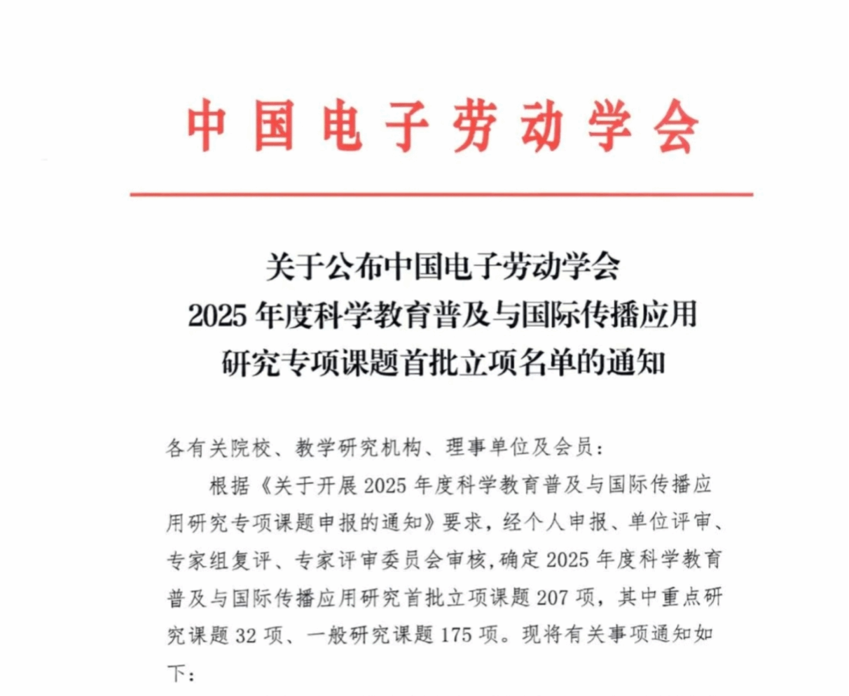 近日,中国电子劳动学会公布了2025年度科学教育普及与国际传播应用研究专项课题首批立项名单。我校组织申报的课题中,有两项成功入选,体现了我校在国际产教融合与职业教育国际化研究方面的扎实基础与前瞻视野。