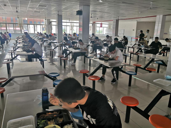 为引导学生养成按照指定进、出口单线同行路线进出1号教学楼习惯,我院制定教学楼出、入口“学生志愿者+辅导员+带班领导”的三级引导值班制度。由1名领导带班, 2名辅导员、6名学生志愿者值班,提醒学生佩戴口罩,引导学生按照指定路线有序进出教学楼及餐厅排队领餐,单人单桌就餐。