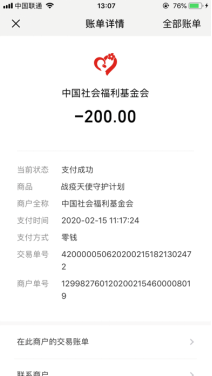 同班同学徐哲,2月15日网上捐赠200元。他们表示尽管不能奔赴一线,但是他们希望能为抗击疫情尽自己的微薄之力。大学生应当有家国情怀,在这场没有硝烟的战场上我院学生勇于贡献出自己的力量,用力所能及的方式加油武汉,加油中国!