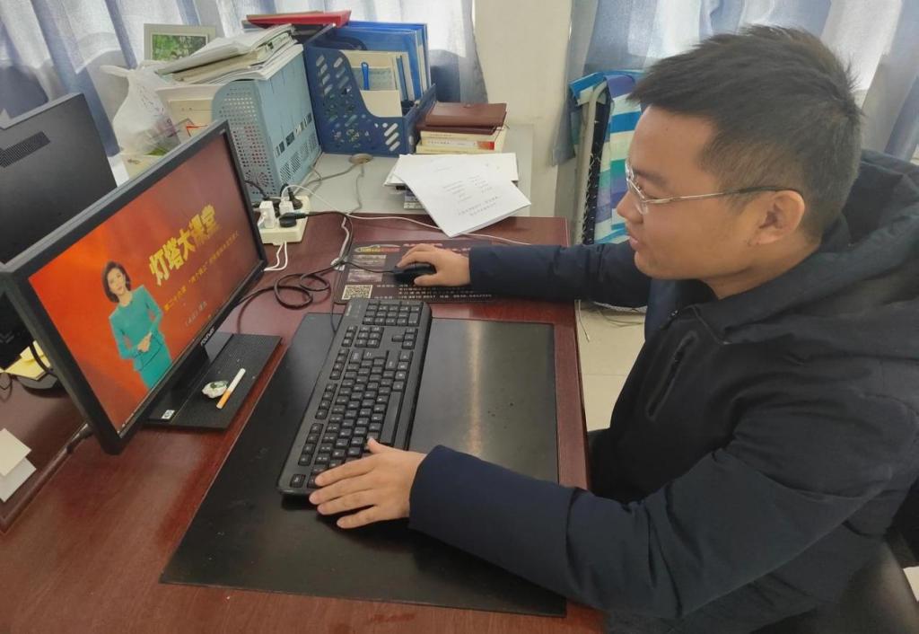机电学院老师在课间观看灯塔大课堂学习