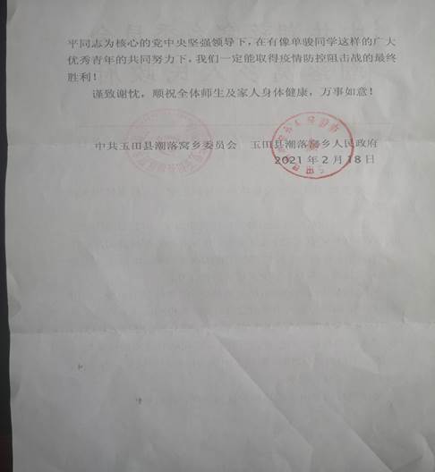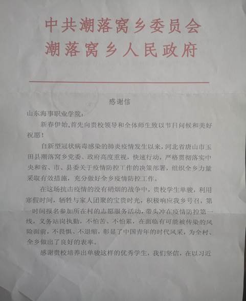 今天,河北省唐山市玉田县潮落窝乡党委发来感谢信,机电与信息工程学院20级工业机器人1班学生单骏同学,利用寒假时间,牺牲与家人团聚的宝贵时光,积极响应乡里的号召,第一时间报名参加村里志愿服务活动,带头冲在疫情防控第一线,义务站岗执勤,不怕苦、不怕累,在面临有可能被传染的风险面前,不畏惧、不退缩,彰显了中国青年的时代风采,为全村、全乡做出了良好的带头模范作用。为此,中共玉田县潮落窝乡委员会特为单骏同学发来感谢信。