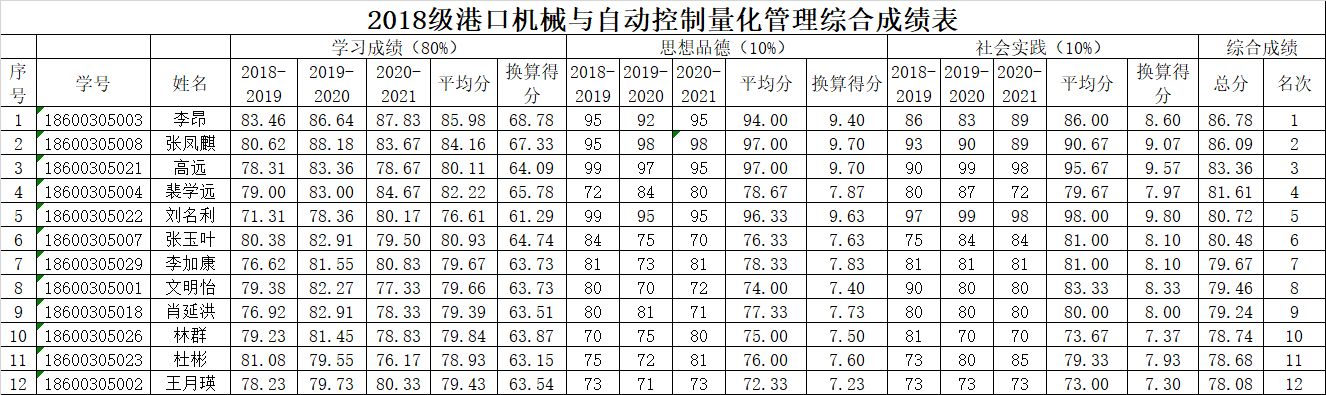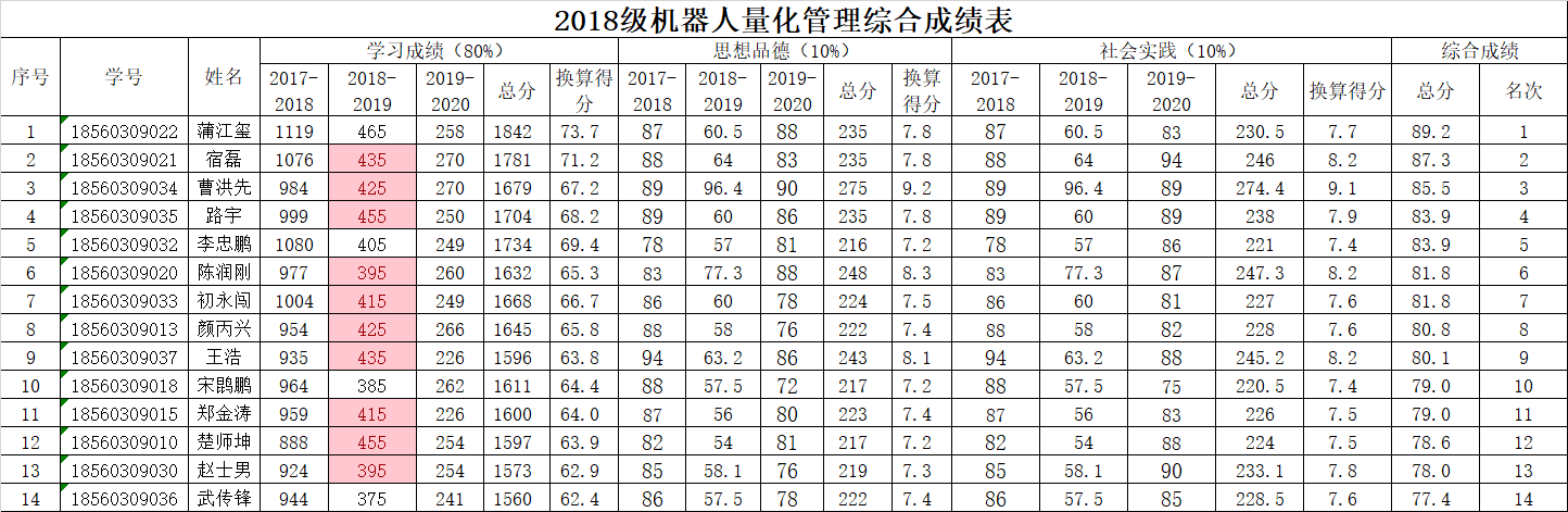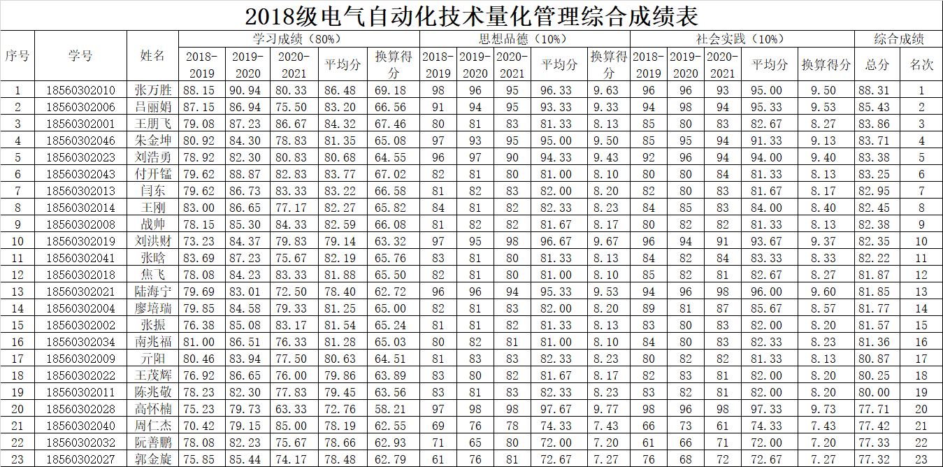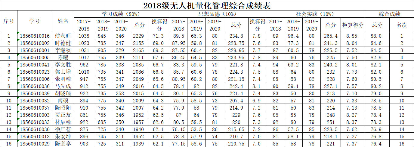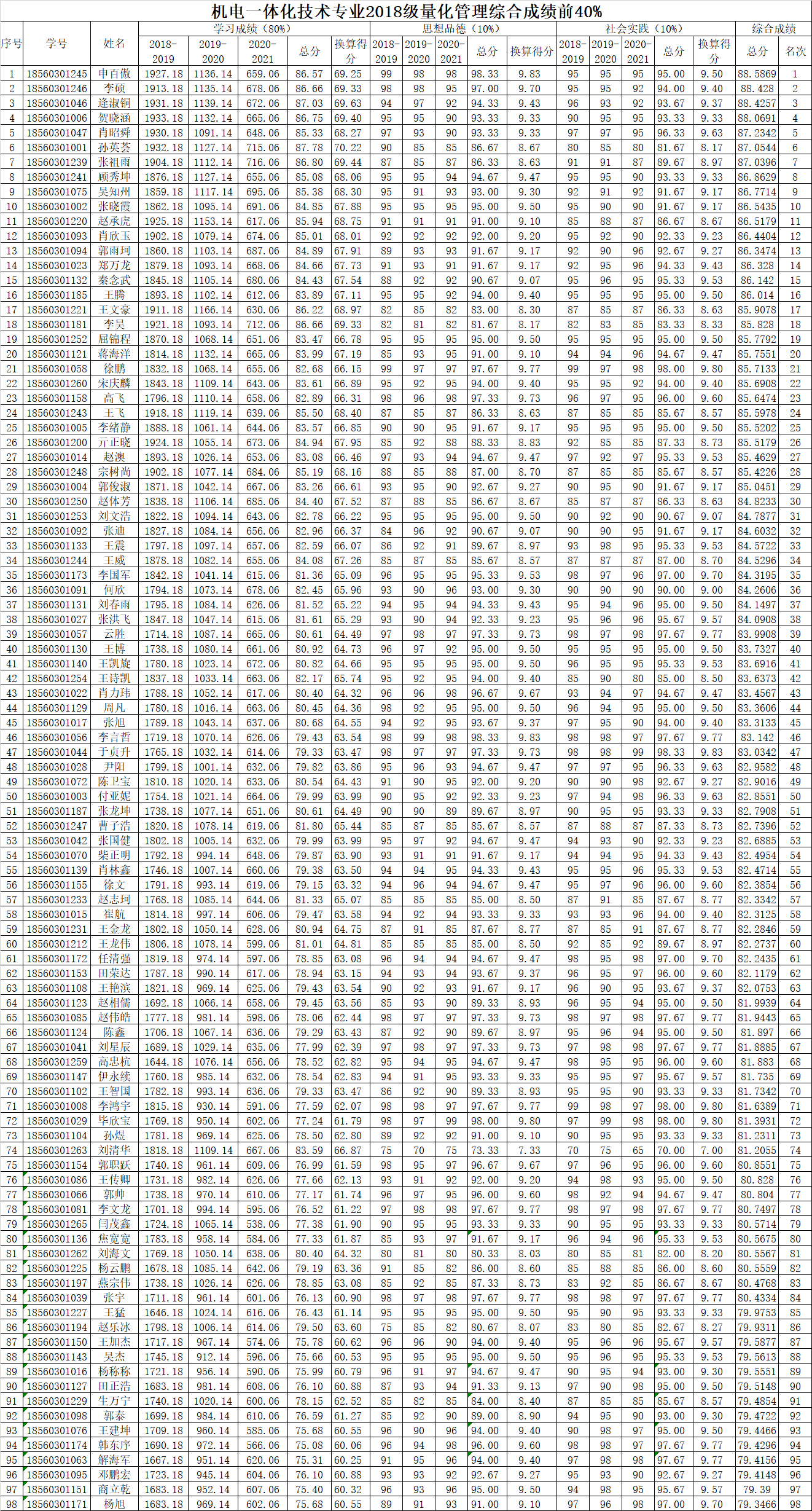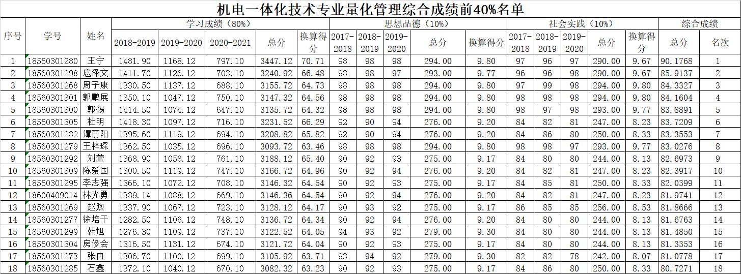 现将 2018 级机电一体化、机电一体化(海大班)、港口机械、电气自动化、无人机应用技术、工业机器人专业学生综合素质测评成绩排名前 40%的人员情况予以公示。