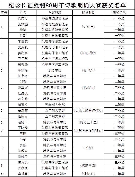 出席本次大赛的评委有学生处张锡功处长、五年制大中专部汤文姣主任、航海学院王涛涛老师、外语与旅游管理系李雪老师、港航与电商学院赵梅老师以及各院系部学生会代表。经过初赛的激烈角逐,取前十五组进入决赛,比赛中,一首又一首慷慨激昂的红军诗歌此起彼伏,经过激烈角逐评委评分,最终产生一等奖2名,二等奖3名,三等级5名。