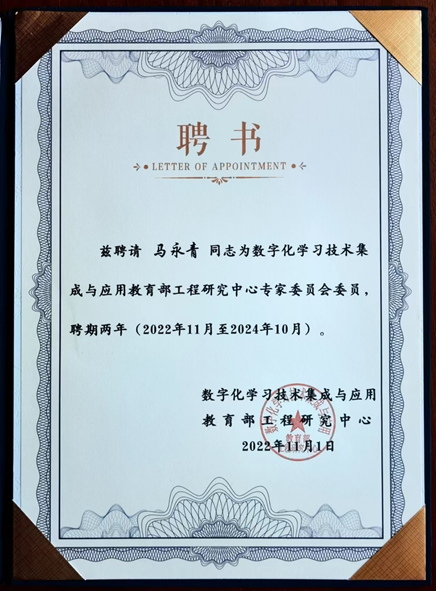 近日,我校机电工程学院院长马永青被聘请为数字化学习技术集成与应用教育部工程研究中心专家委会委员。