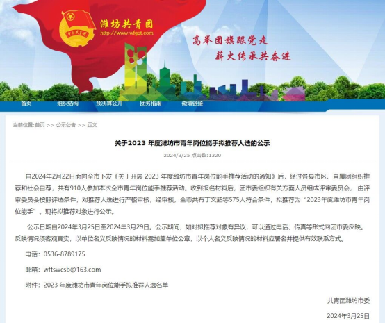 近日,共青团潍坊市委下发了《关于2023 年度潍坊市青年岗位能手拟推荐人选的公示》,机电工程学院王岸青、刘广洲、郭彤彤三位老师荣获“2023年度潍坊市青年岗位能手”荣誉称号。